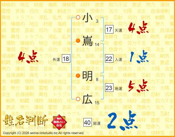 小(3画)嶌(14画) 明(8画)広(15画)
