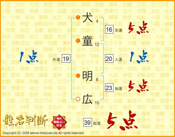 犬(4画)童(12画) 明(8画)広(15画)