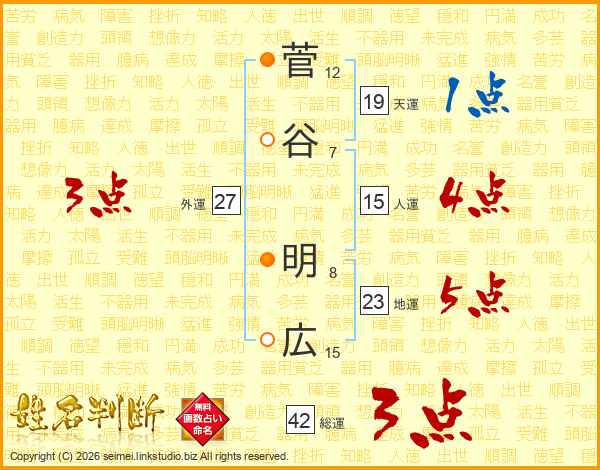 あなたの人生を表す1番重要な運勢です。生涯を通じて影響する総合運となり、主に50歳以降の晩年期に影響を及ぼします。苗字と名前の合計画数。