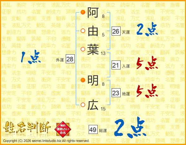 阿(8画)由(5画)葉(13画) 明(8画)広(15画)