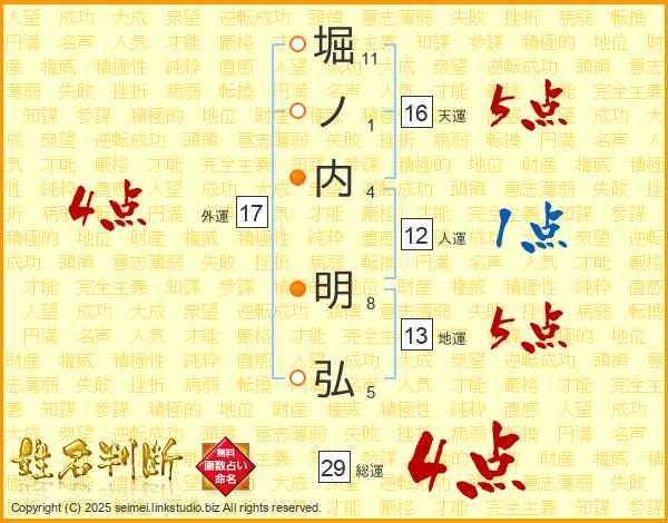 堀(11画)ノ(1画)内(4画) 明(8画)弘(5画)