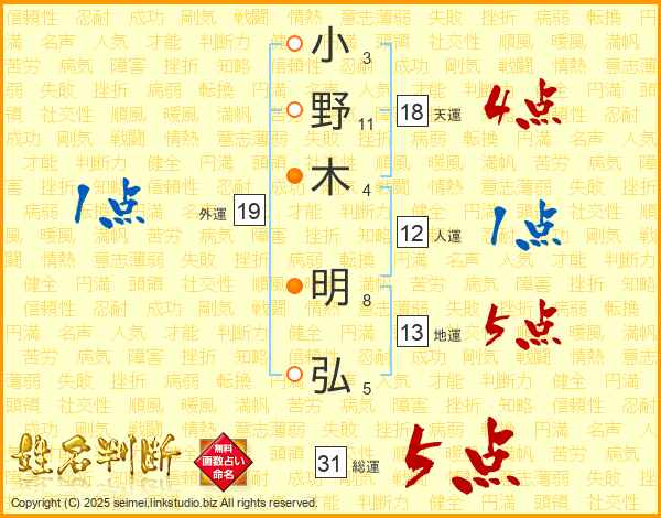 小野木明弘さんの総運は31画の5点!