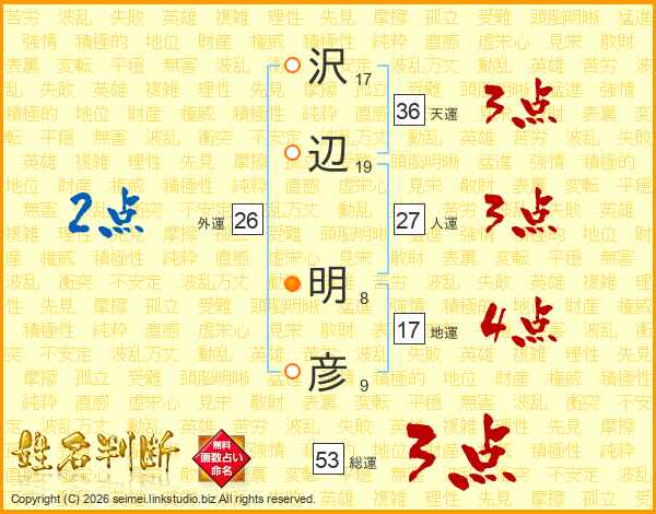 沢(17画)辺(19画) 明(8画)彦(9画)