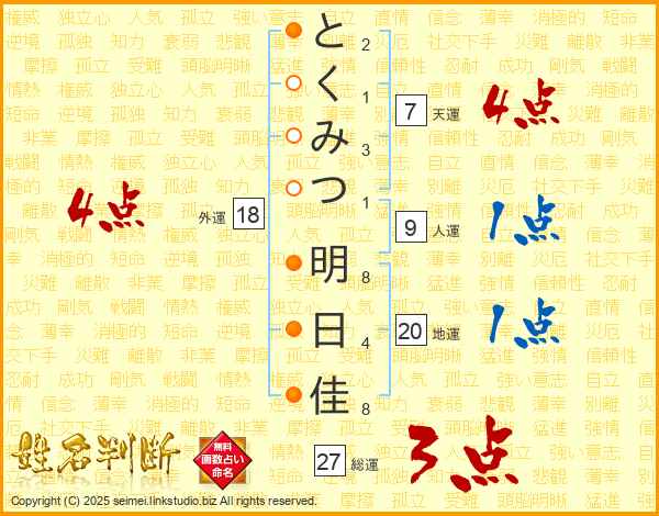 と(2画)く(1画)み(3画)つ(1画) 明(8画)日(4画)佳(8画)