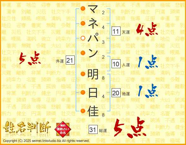 マ(2画)ネ(4画)パ(3画)ン(2画) 明(8画)日(4画)佳(8画)