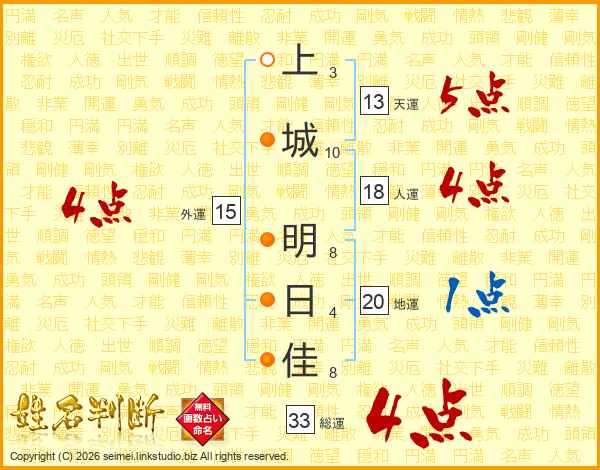 上(3画)城(10画) 明(8画)日(4画)佳(8画)