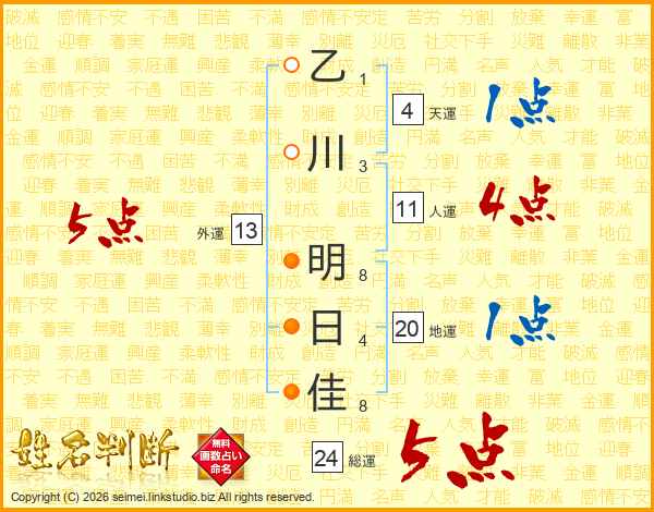 乙(1画)川(3画) 明(8画)日(4画)佳(8画)