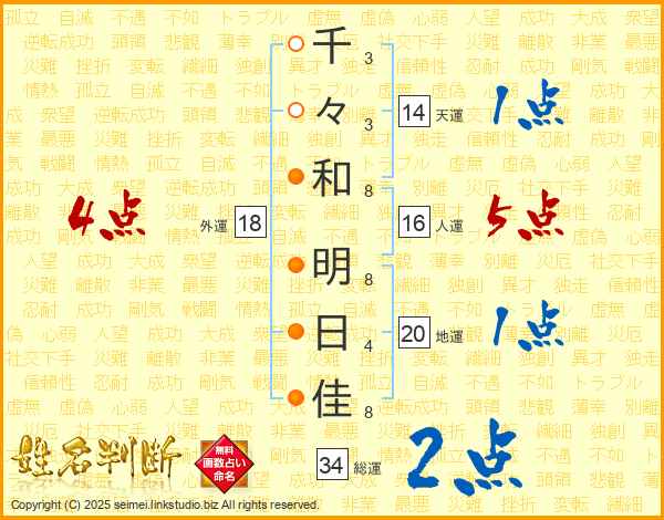 千(3画)々(3画)和(8画) 明(8画)日(4画)佳(8画)