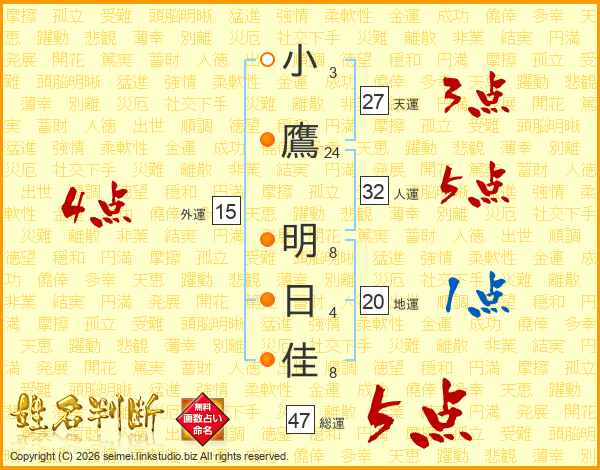 小(3画)鷹(24画) 明(8画)日(4画)佳(8画)