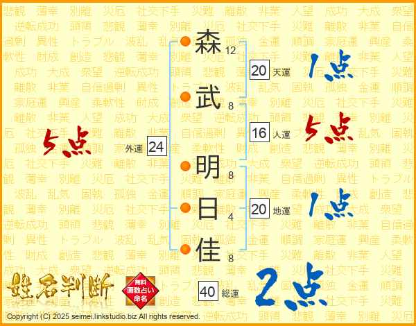 森(12画)武(8画) 明(8画)日(4画)佳(8画)