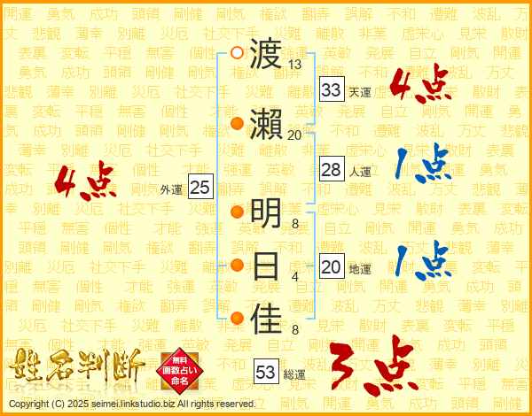 渡(13画)瀨(20画) 明(8画)日(4画)佳(8画)