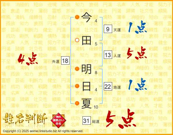 今(4画)田(5画) 明(8画)日(4画)夏(10画)