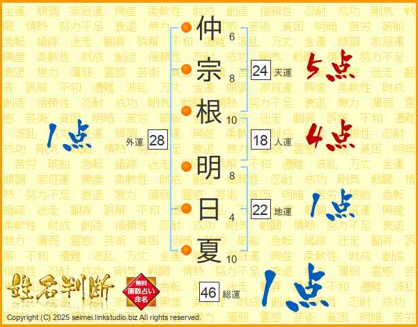 仲(6画)宗(8画)根(10画) 明(8画)日(4画)夏(10画)