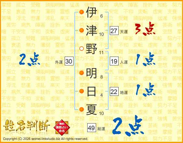 伊(6画)津(10画)野(11画) 明(8画)日(4画)夏(10画)