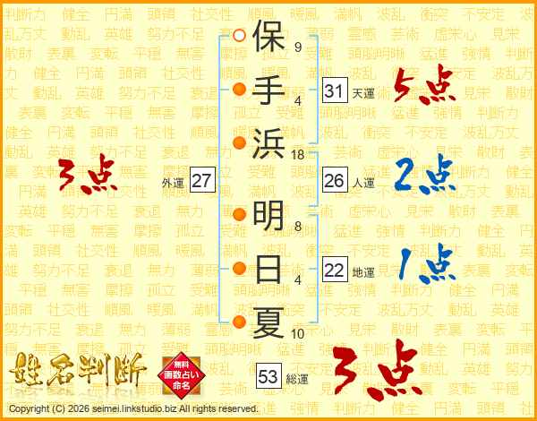 保(9画)手(4画)浜(18画) 明(8画)日(4画)夏(10画)