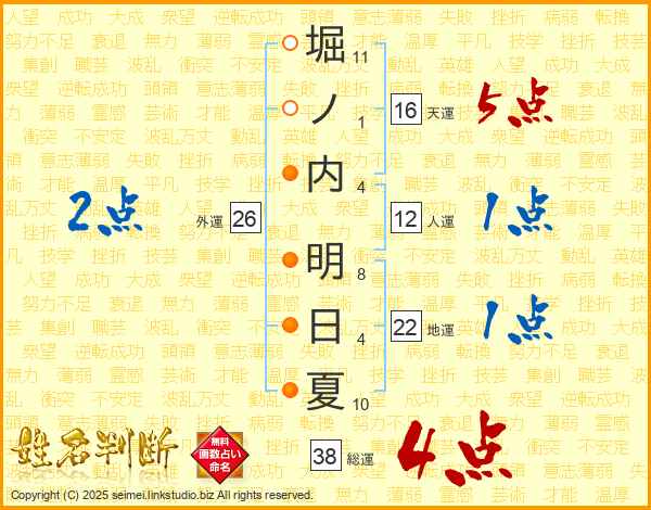 堀(11画)ノ(1画)内(4画) 明(8画)日(4画)夏(10画)