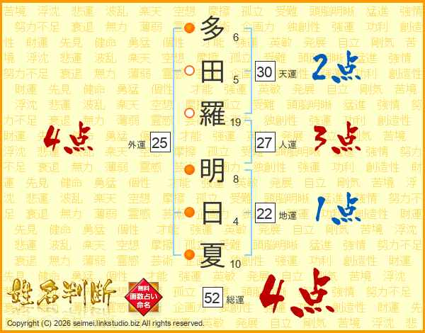 多(6画)田(5画)羅(19画) 明(8画)日(4画)夏(10画)