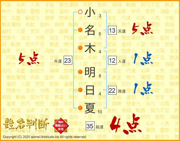 小(3画)名(6画)木(4画) 明(8画)日(4画)夏(10画)