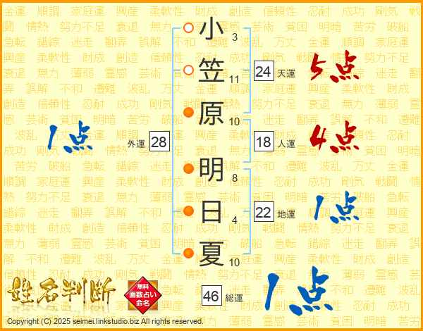 小(3画)笠(11画)原(10画) 明(8画)日(4画)夏(10画)