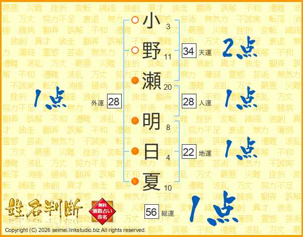 小野瀬明日夏さんの総運は56画の1点!