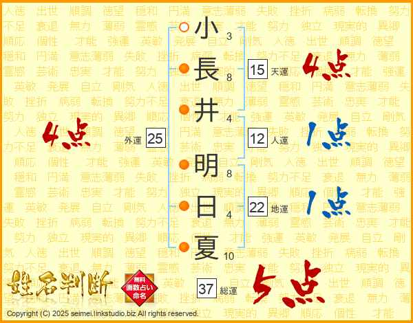 小(3画)長(8画)井(4画) 明(8画)日(4画)夏(10画)