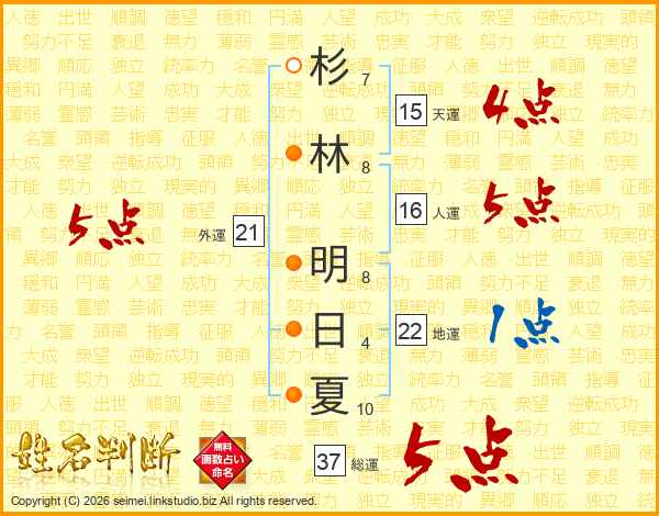 杉林明日夏さんの総運は37画の5点!