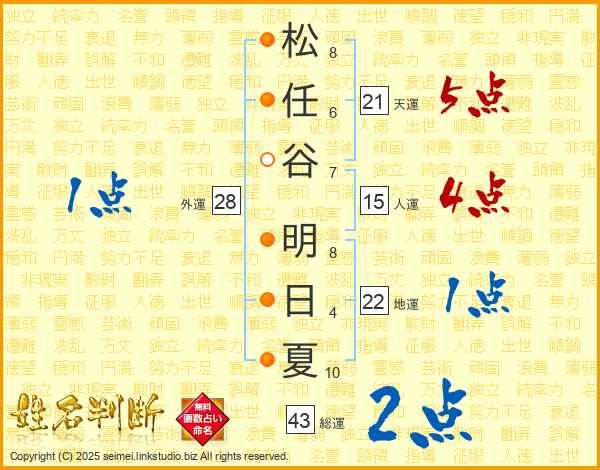 松(8画)任(6画)谷(7画) 明(8画)日(4画)夏(10画)