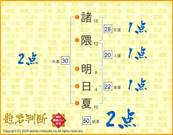 諸(16画)隈(12画) 明(8画)日(4画)夏(10画)