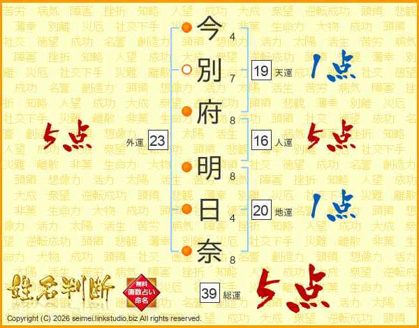 今(4画)別(7画)府(8画) 明(8画)日(4画)奈(8画)