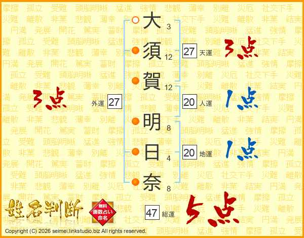 大(3画)須(12画)賀(12画)  明(8画)日(4画)奈(8画)