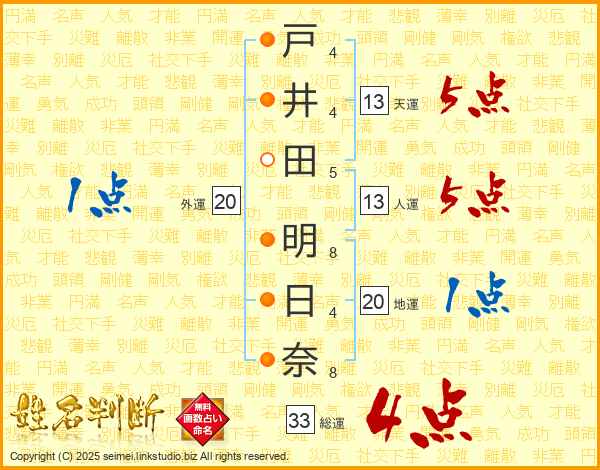 戸(4画)井(4画)田(5画) 明(8画)日(4画)奈(8画)