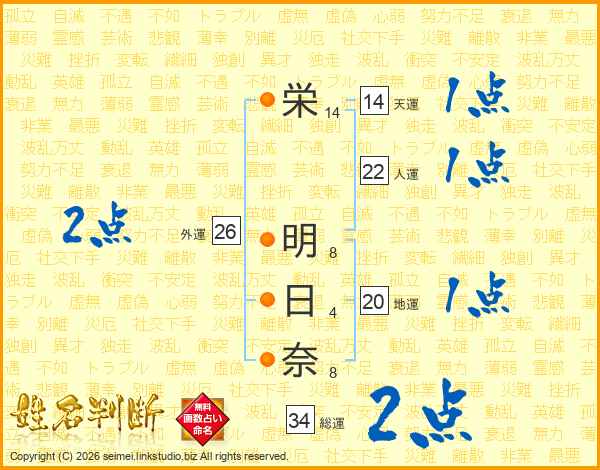 栄(14画) 明(8画)日(4画)奈(8画)