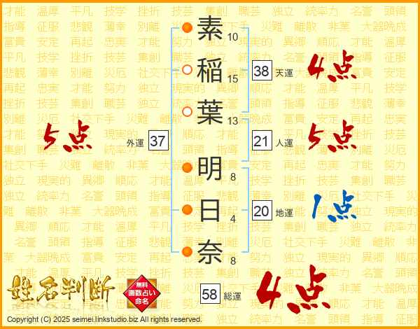 素(10画)稲(15画)葉(13画) 明(8画)日(4画)奈(8画)