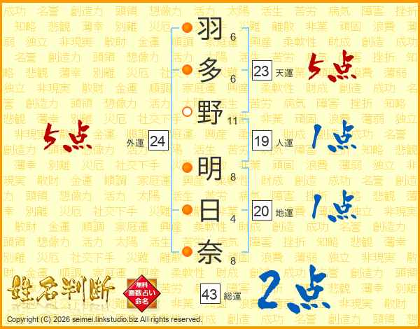 羽多野明日奈さんの外運は24画の5点!