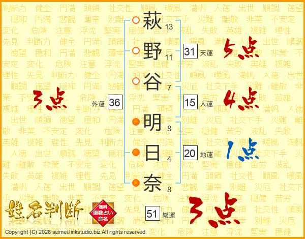 萩(13画)野(11画)谷(7画) 明(8画)日(4画)奈(8画)