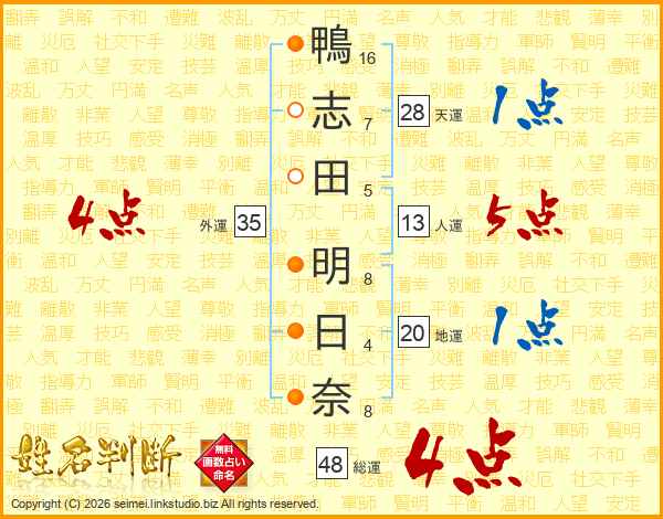 鴨(16画)志(7画)田(5画) 明(8画)日(4画)奈(8画)