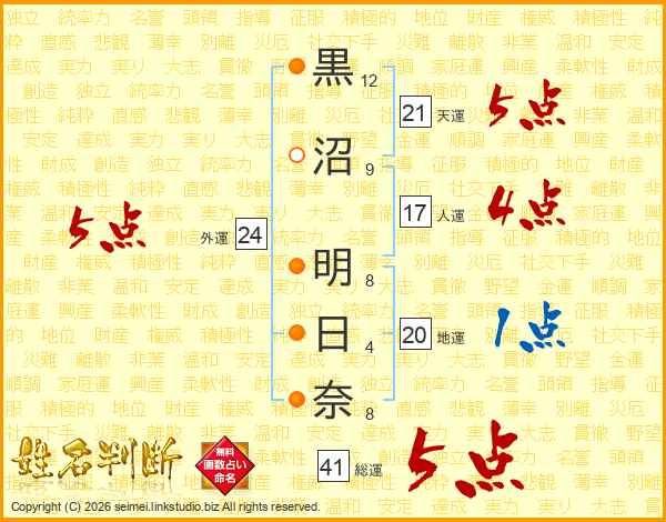 黒沼明日奈さんの総運は41画の5点!
