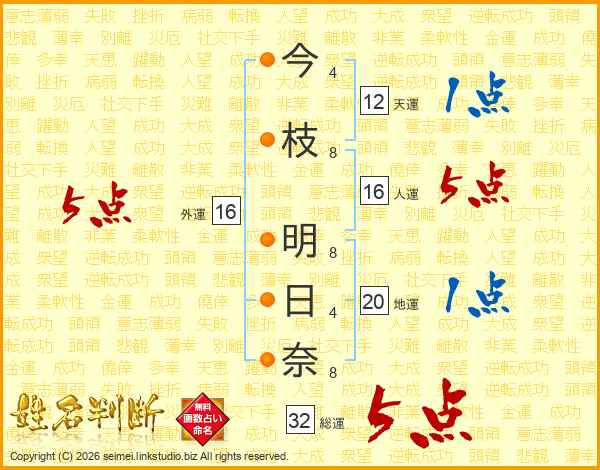 今(4画)枝(8画) 明(8画)日(4画)奈(8画)