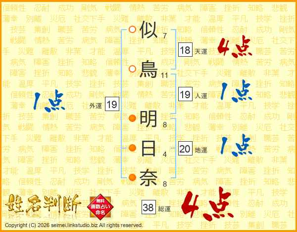 似(7画)鳥(11画) 明(8画)日(4画)奈(8画)