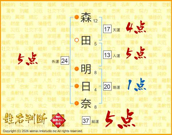 森(12画)田(5画) 明(8画)日(4画)奈(8画)