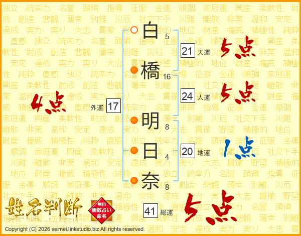白橋明日奈さんの総運は41画の5点!