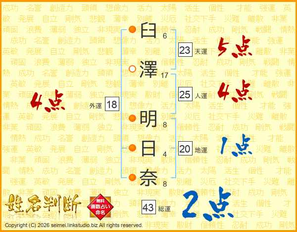 臼(6画)澤(17画) 明(8画)日(4画)奈(8画)
