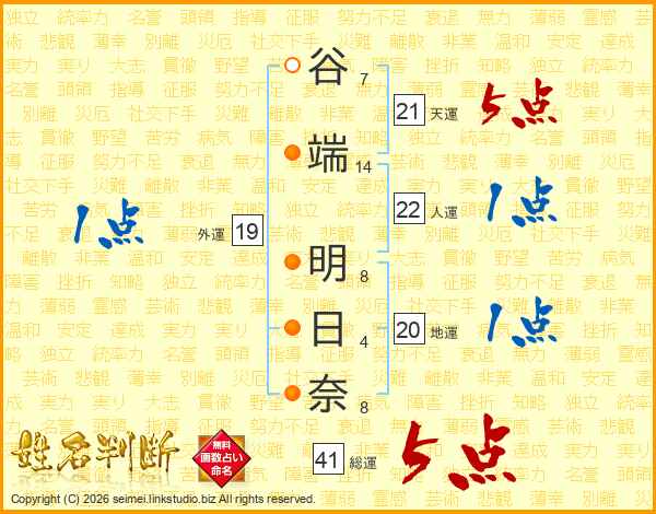 谷(7画)端(14画) 明(8画)日(4画)奈(8画)