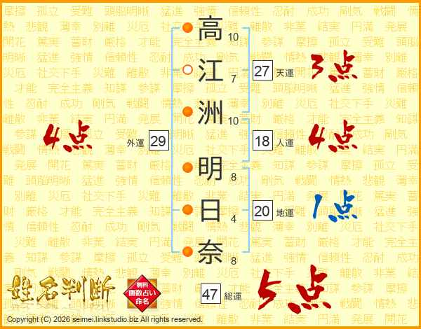 高(10画)江(7画)洲(10画) 明(8画)日(4画)奈(8画)