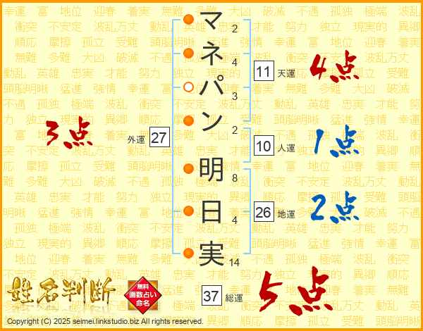 生活面を象徴する運勢です。外部から受ける影響力を表し、結婚運、家庭運や職場、環境への順応性を表します。総運から人運を引いた画数。姓や名が1文字の場合を除く。