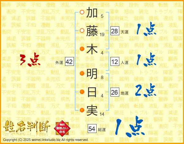 加(5画)藤(19画)木(4画) 明(8画)日(4画)実(14画)