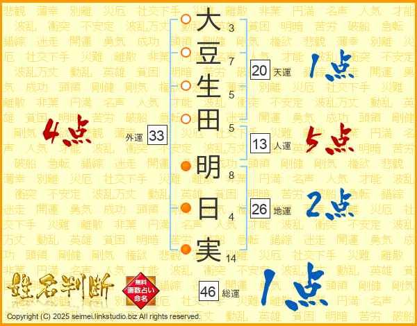 大(3画)豆(7画)生(5画)田(5画) 明(8画)日(4画)実(14画)