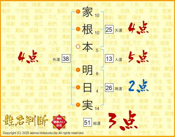 家(10画)根(10画)本(5画) 明(8画)日(4画)実(14画)