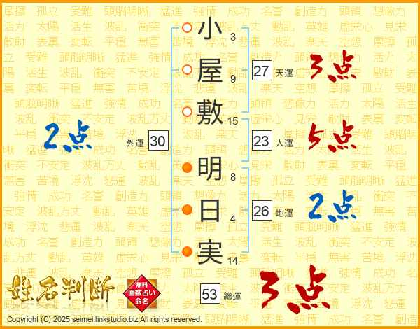 小(3画)屋(9画)敷(15画) 明(8画)日(4画)実(14画)