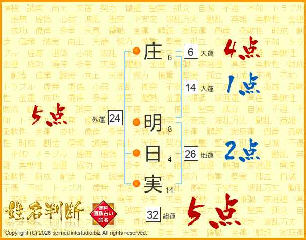 生活面を象徴する運勢です。外部から受ける影響力を表し、結婚運、家庭運や職場、環境への順応性を表します。総運から人運を引いた画数。姓や名が1文字の場合を除く。